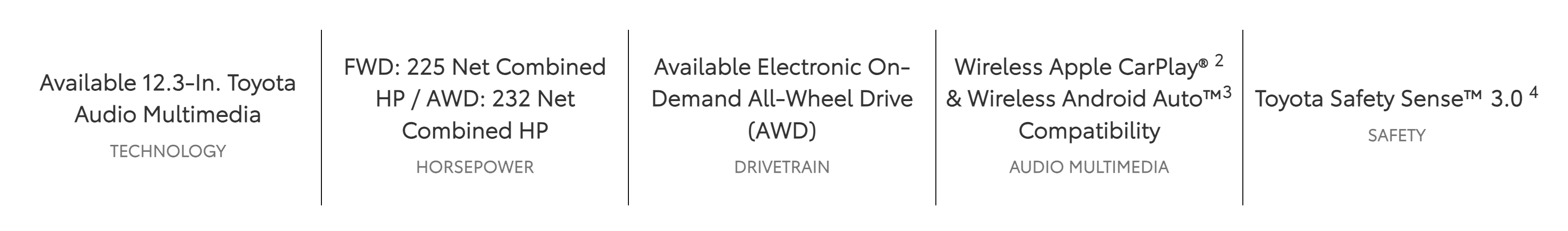 3Google, Android, Android Auto, YouTube Music and other marks are trademarks of Google LLC. Wireless use of Android Auto requires a compatible Android 11.0+ phone and compatible active data plan. Check g.co/androidauto/requirements for compatibility. Operability depends on network availability, a cellular connection and GPS signal. Services subject to change at any time without notice. Data charges may apply. To learn more, go to https://www.toyota.com/audio-multimedia/. To learn more about Toyota's Connected Services data collection, use, sharing and retention practices, please visit https://www.toyota.com/support/privacy-notice/.